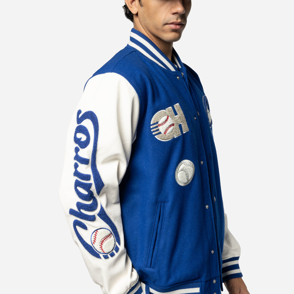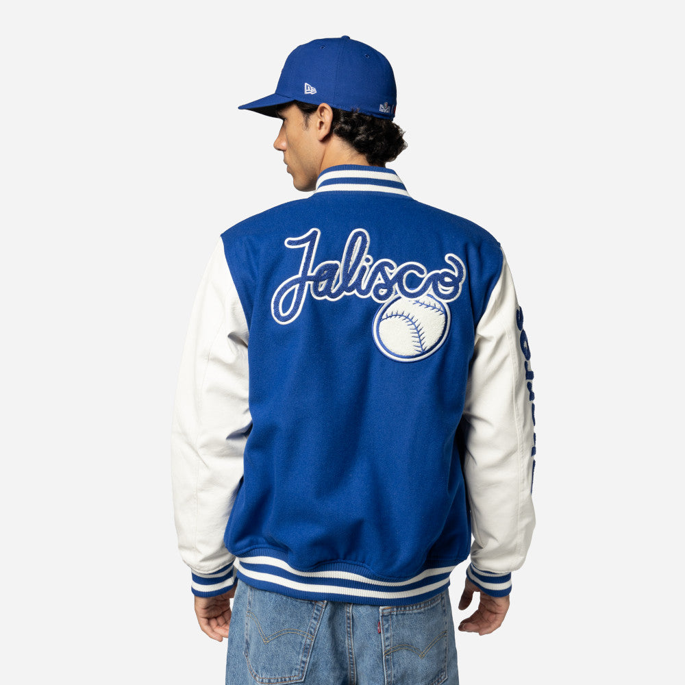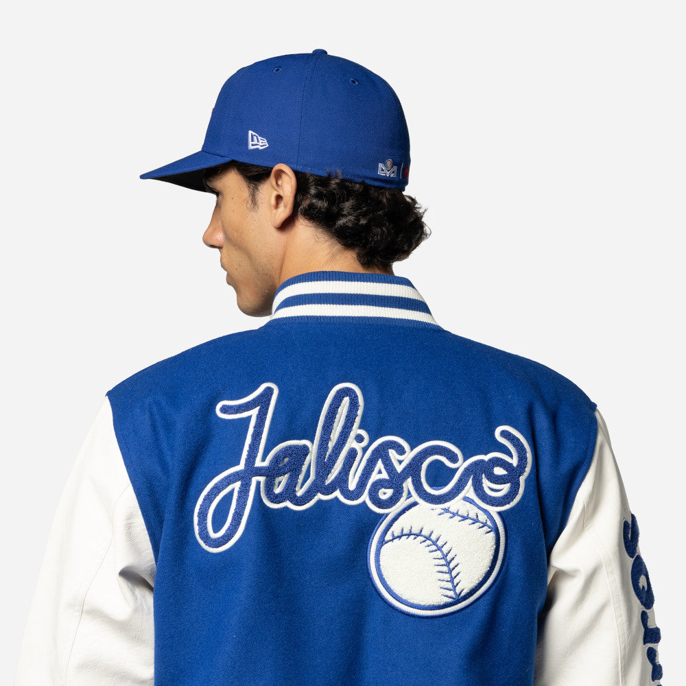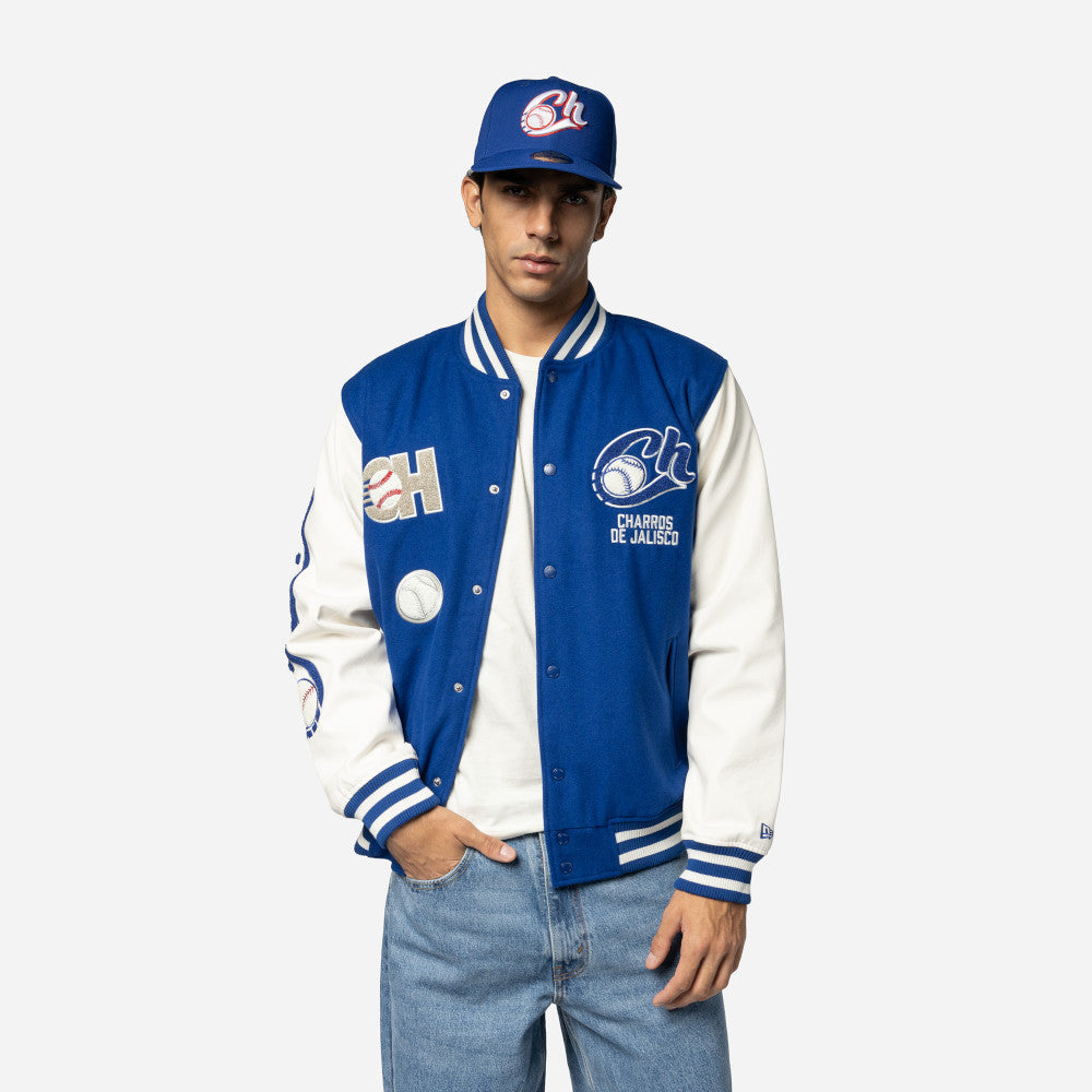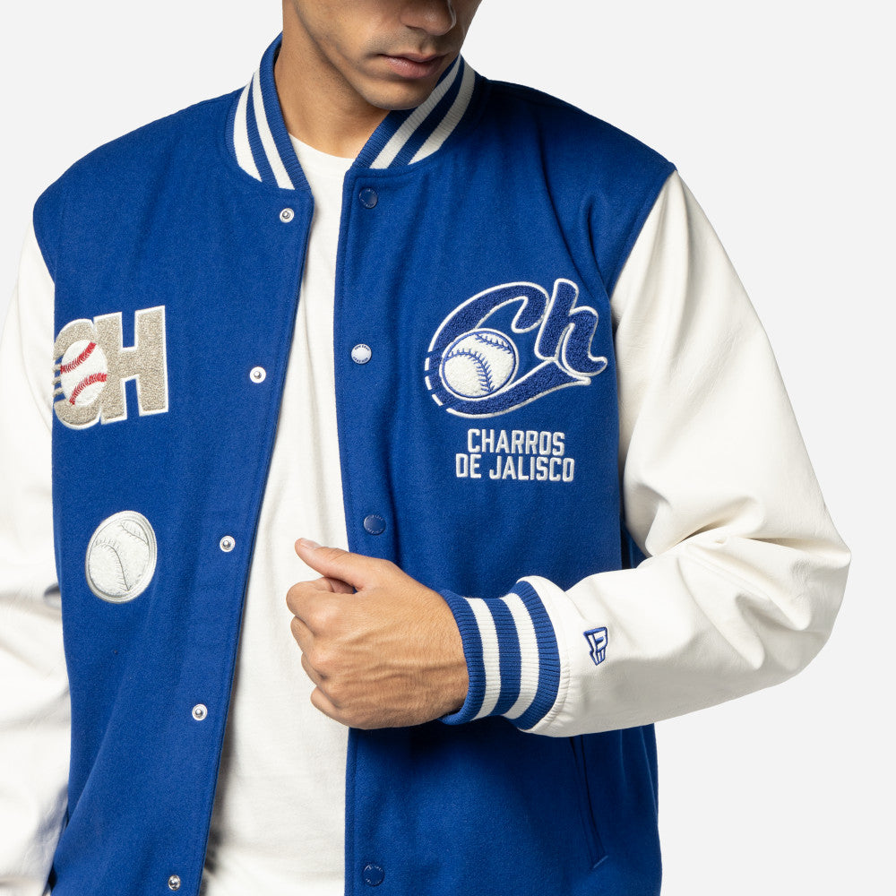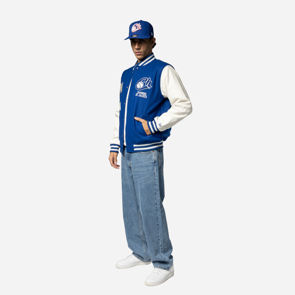 Esta Chamarra Varsity New Era de Charros de Jalisco de la colección LAMP Supernature presenta un diseño con el logotipo actual y retro de los Charros bordados en la parte frontal, el nombre del equipo en la manga derecha, Jalisco al reverso y el flag de New Era bordado en la manga izquierda. Cómprala ya.