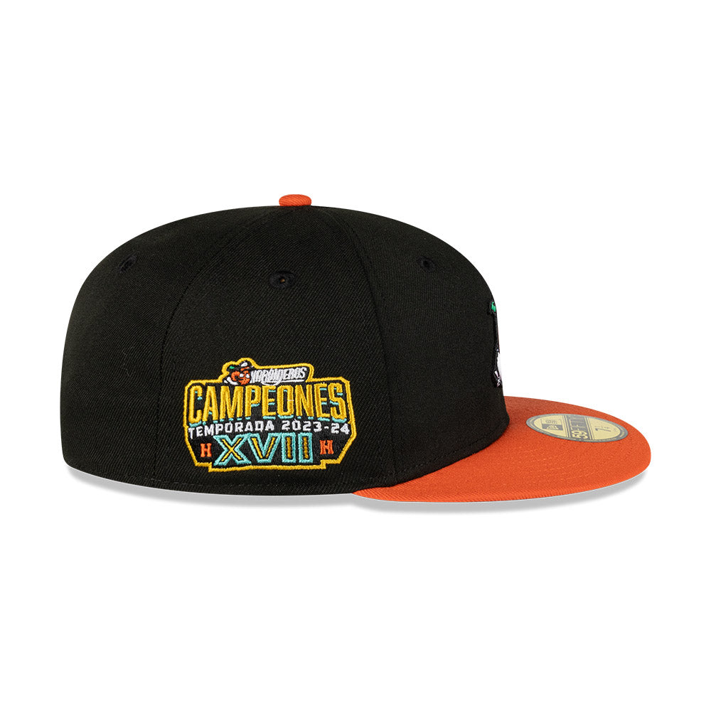 Esta gorra plana New Era 59FIFTY de Naranjeros de Hermosillo de la colección LAMP Game Caps 2024 presenta un diseño con la mascota de los Naranjeros bordado en los paneles frontales, un parche de campeones del lado derecho, el logo de la LAMP al reverso y el flag de New Era bordado del lado izquierdo. Cómprala ya.