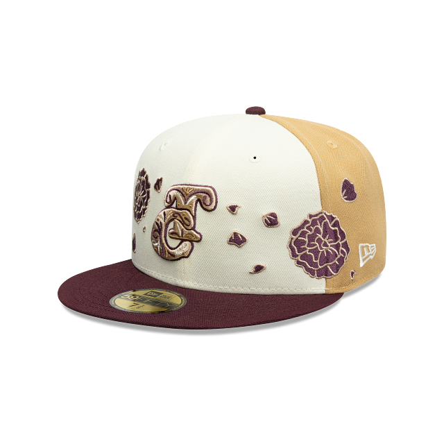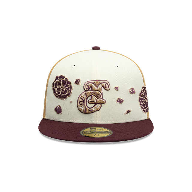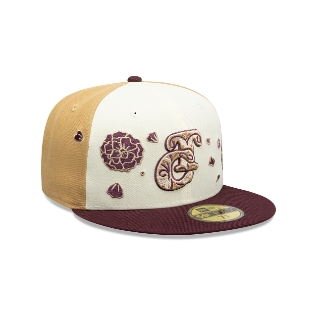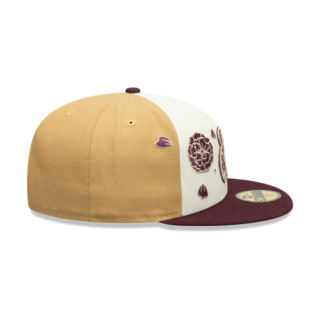 Esta gorra plana New Era 59FIFTY de Tomateros de Culiacán de la colección LAMP Game Caps presenta un diseño inspirado en el Día de Murertos con flores de cempasúchil, el logotipo de los Tomateros bordado en los paneles frontales, el logo de la LAMP en la parte de atrás y el flag de New Era bordado del lado izquierdo. Cómprala ya.